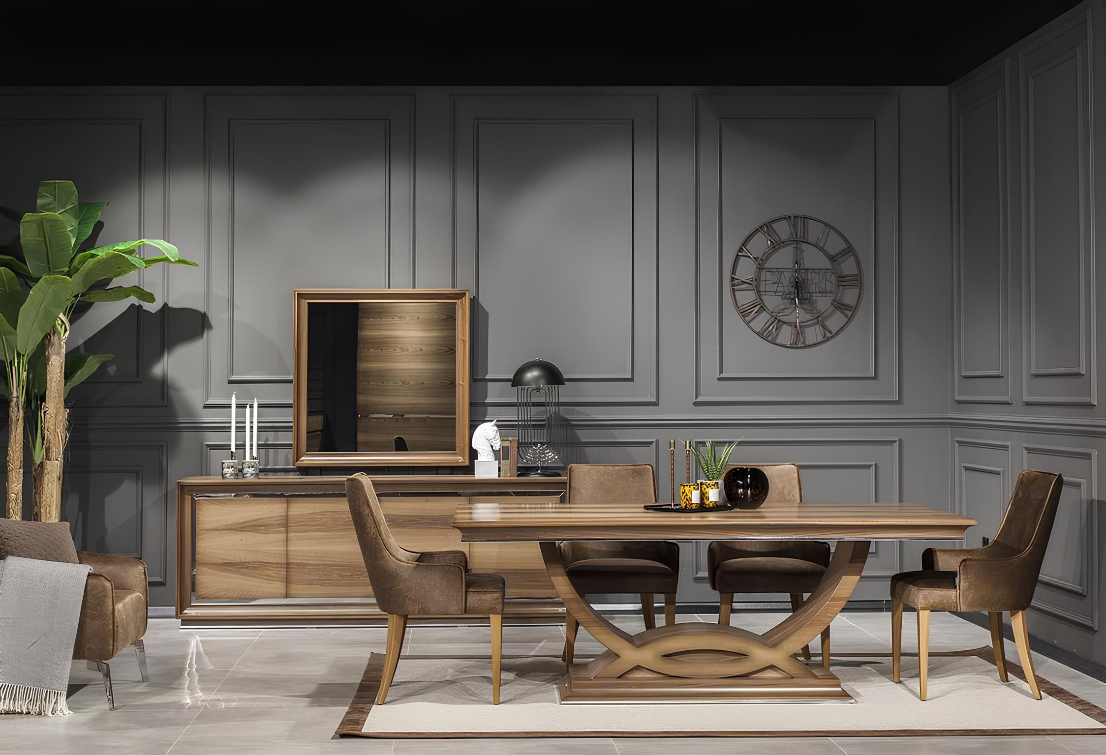 9-osainen ruokailuhuoneen kalustesetti, johon kuuluu pöytä, tuolit, lipasto ja peili | xlhuonekalut.fi