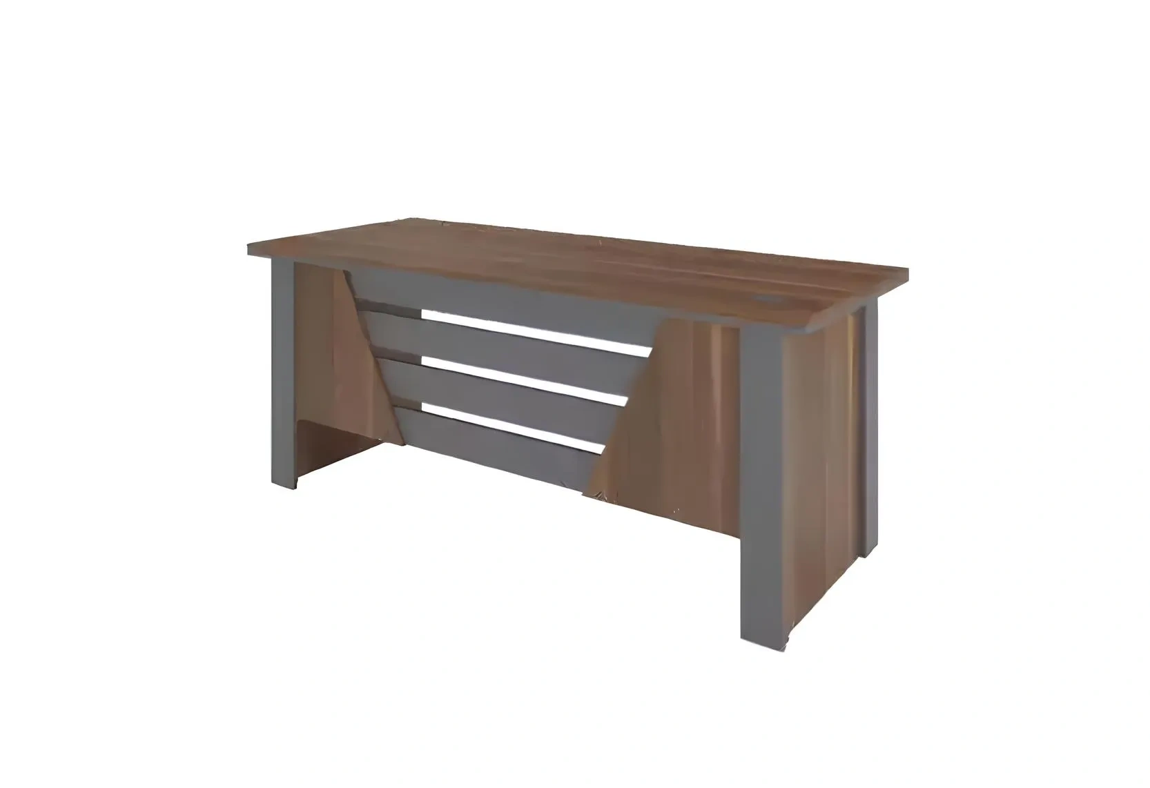 Moderni toimistokaluste, jossa on pöytä, hyllyt ja lipasto