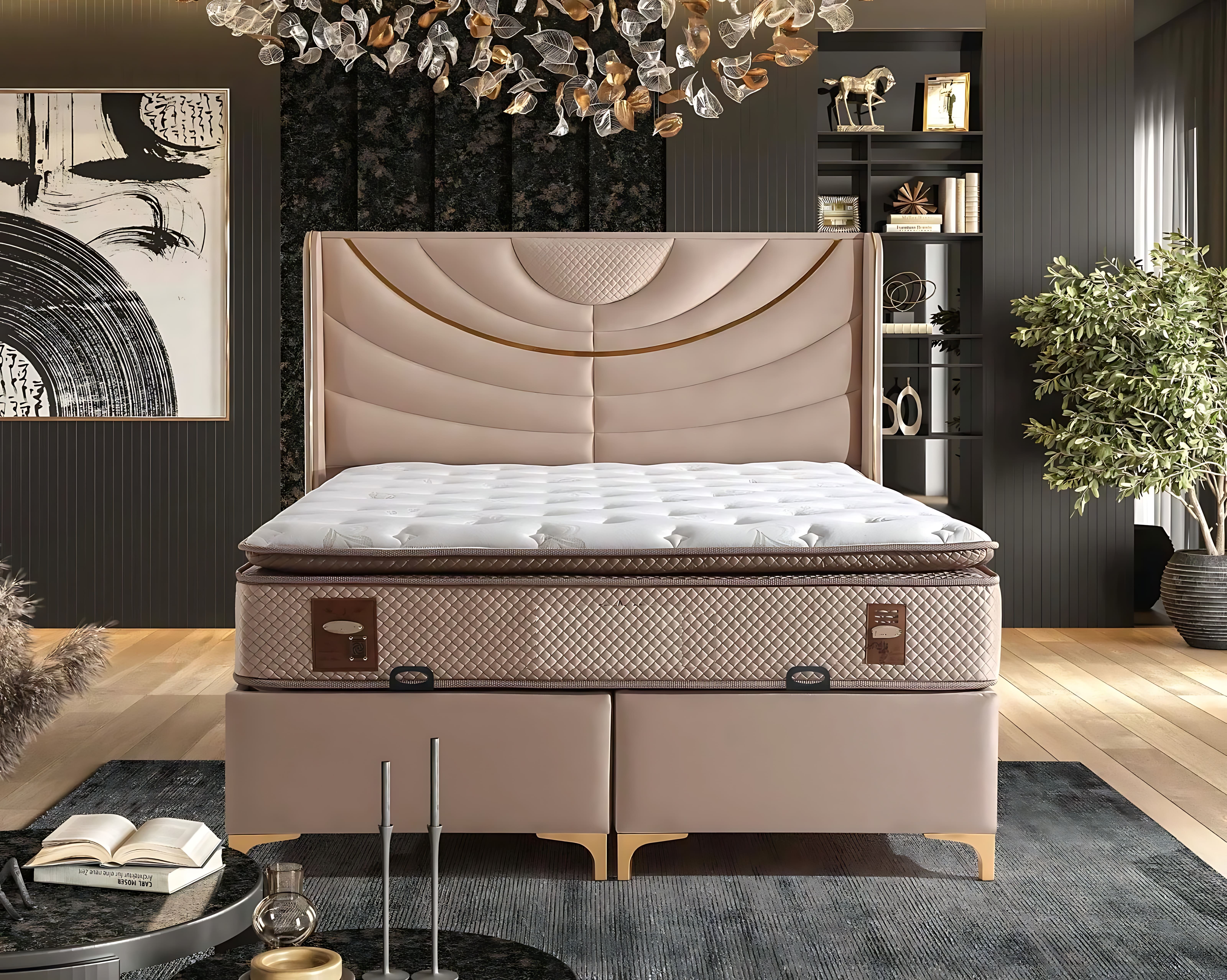 Tyylikäs beige sänky tekstiili- ja puupatjalla yhdistää ajattoman muotoilun ja ensiluokkaiset materiaalit. Sen pehmeä beige sävy luo rauhoittavan tunnelman, joka täydentää eksklusiivista kodin sisustusta. Huolellisesti valitut puu- ja tekstiilimateriaalit tarjoavat sekä esteettistä että käytännöllistä laatua, varmistaen pitkäikäisyyden ja mukavuuden. Tämä sänky ei ole vain nukkumispaikka, vaan myös katseenvangitsija, joka lisää tilan eleganssia. Valitse tämä sänky, jos arvostat laatua, tyyliä ja yksilöllisyyttä, ja haluat luoda kotiisi ympäristön, joka heijastaa korkeaa elämänlaatua.