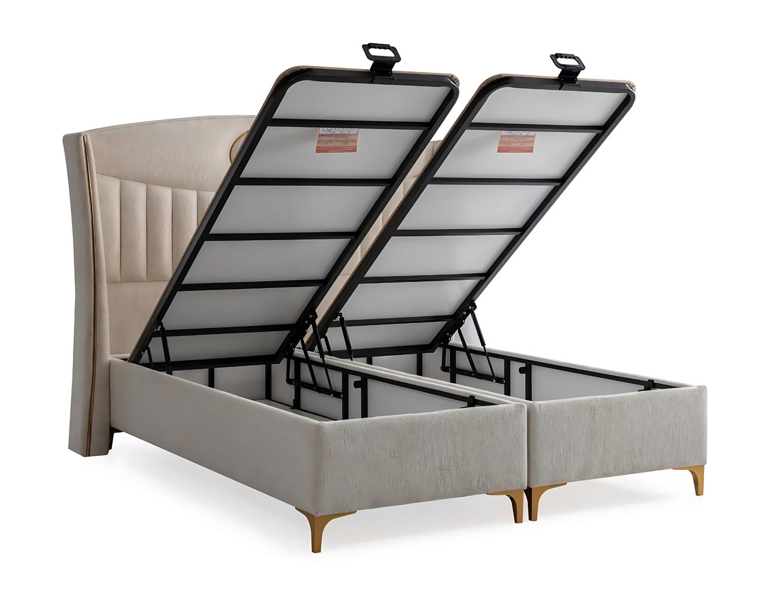 Tyylikäs sänky vaaleanbeigellä tekstiili- ja puupatjalla
