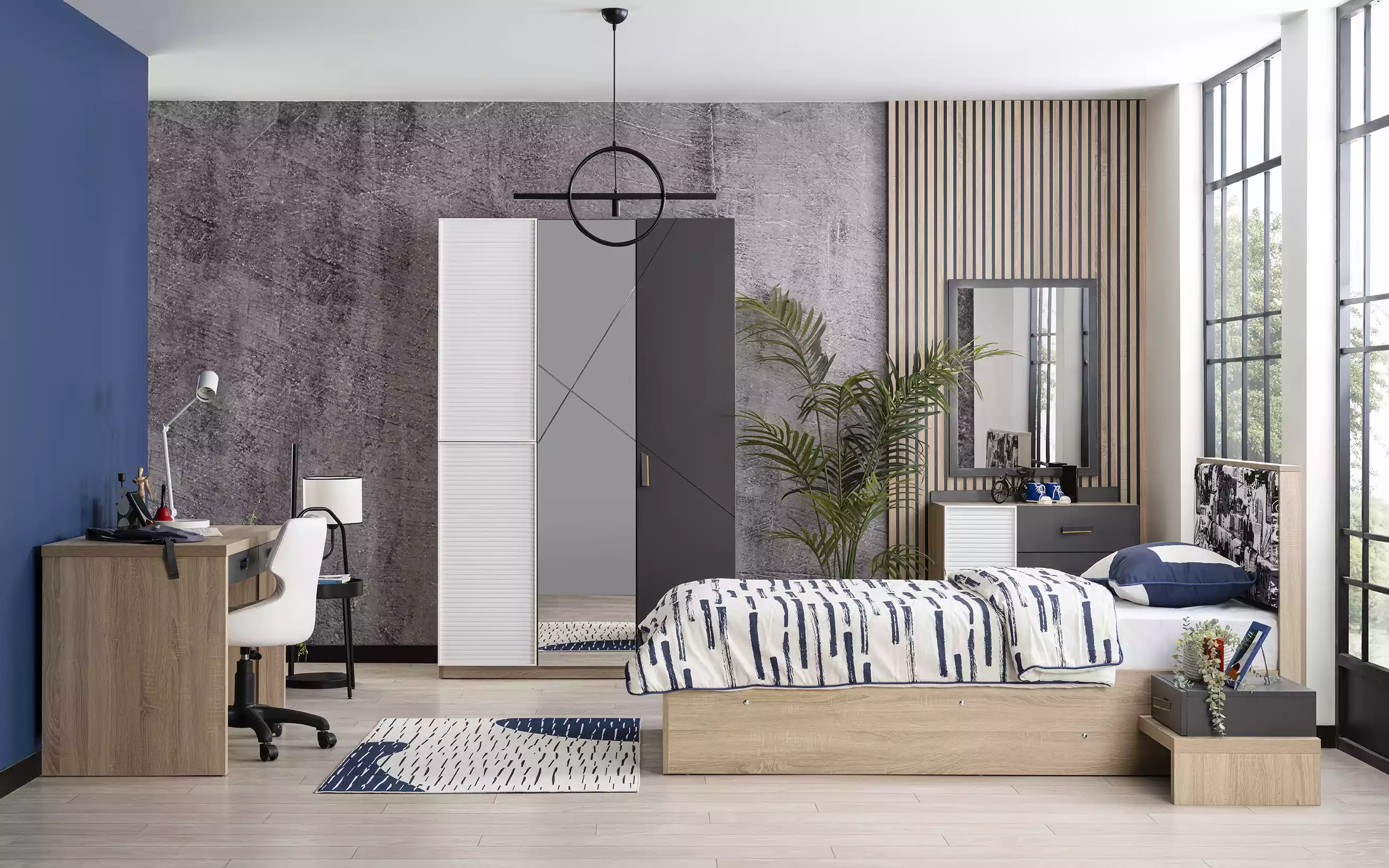 Harmaa puinen kaappi, jossa on kolme ovea ja peili lastenhuoneeseen | xlhuonekalut.fi
