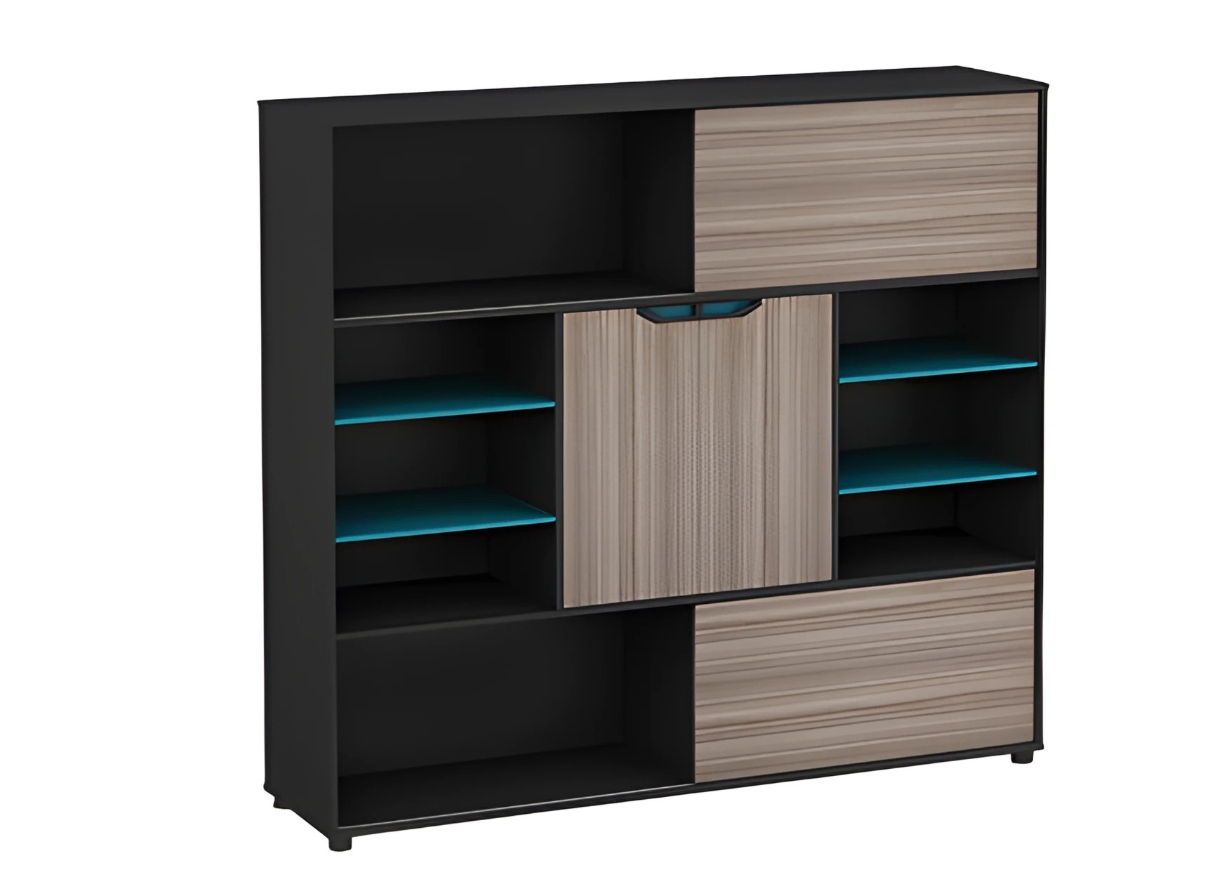 Moderni puinen lipasto, ruskea ja musta, ovilla ja hyllyillä, sininen, toimistoon | xlhuonekalut.fi