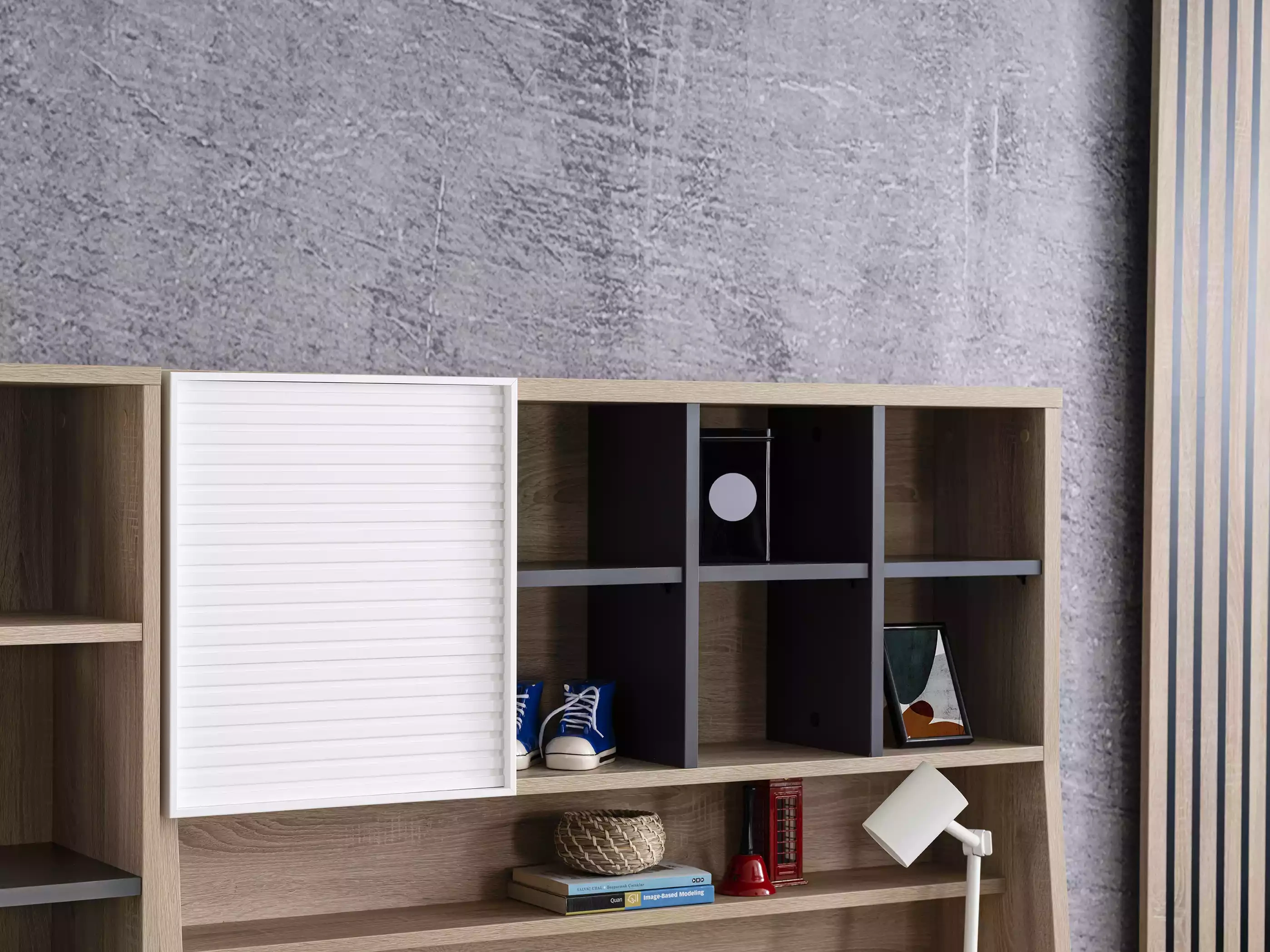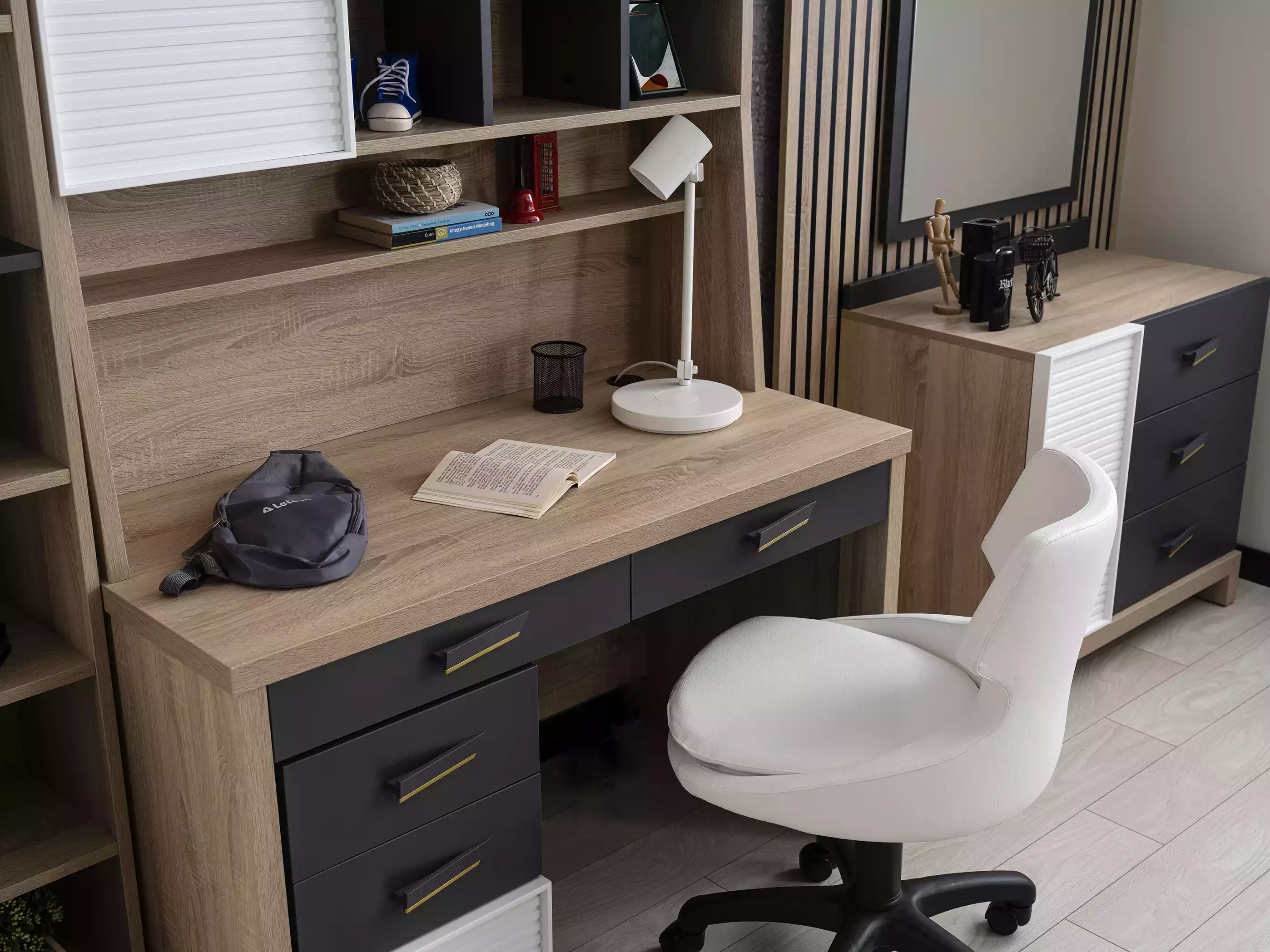 Lasten huonekalusetti yhdistää ajattoman muotoilun ja huipputason materiaalit, luoden täydellisen ympäristön nuorille asukkaille. Harmaan puun sävy tuo rauhoittavaa harmoniaa, joka sointuu kauniisti muuhun sisustukseen. Setti koostuu kahdeksasta huolellisesti suunnitellusta osasta, jotka tarjoavat käytännöllisyyttä ja tyyliä. Sänky tarjoaa mukavuutta ja tukee lapsesi unia, kun taas muut kalusteet luovat inspiroivan tilan leikkiin ja oppimiseen. Tämä huonekalusetti on enemmän kuin vain kalusteita; se on investointi elämänlaatuun ja ainutlaatuiseen, tyylikkääseen kotiin. Valitse tämä huonekalusetti, ja anna lapsesi kasvaa ympäristössä, joka heijastaa hienostunutta elämäntyyliä.