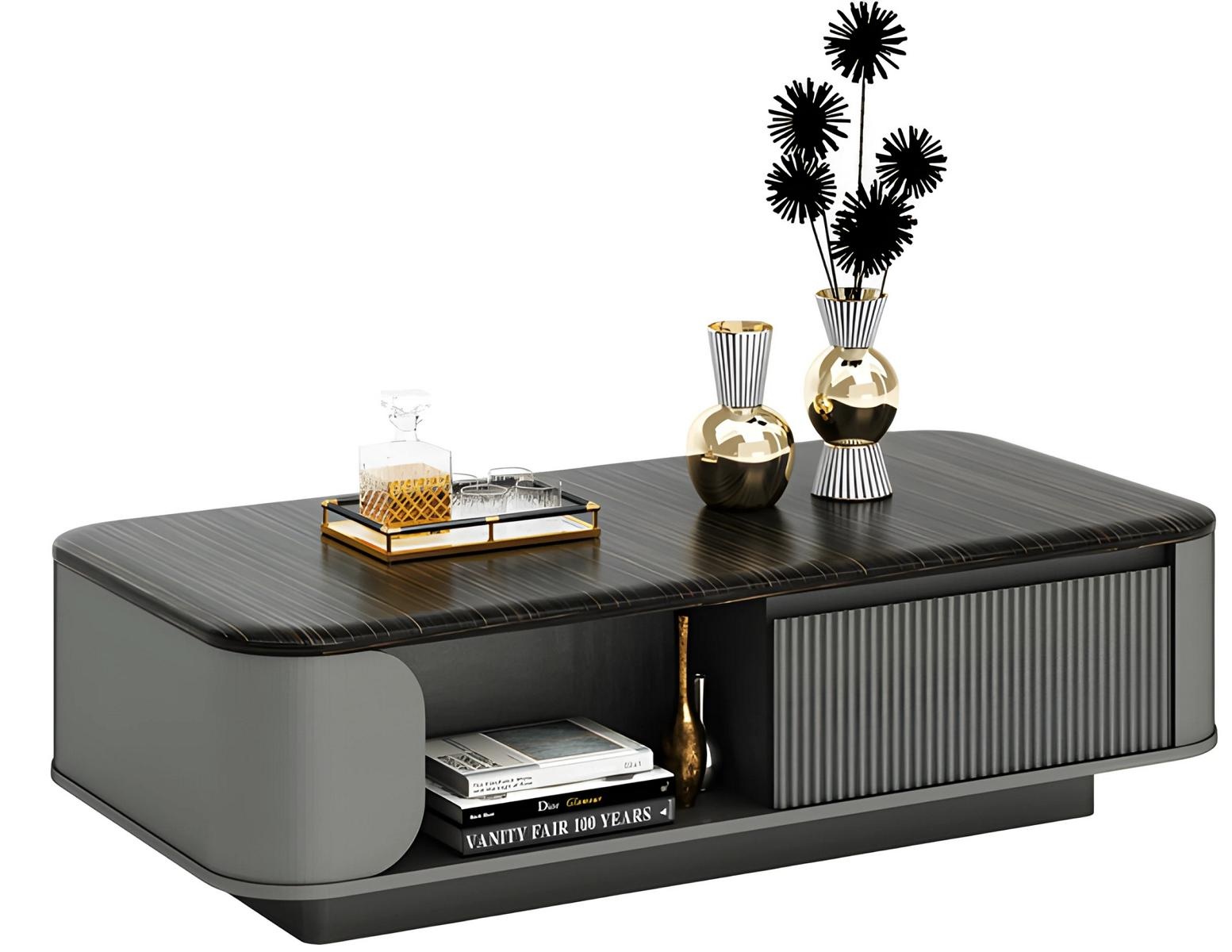 Moderni matala pöytä tyylikkäällä muotoilulla ja mustalla pinnalla sekä avoimilla hyllyillä | xlhuonekalut.fi