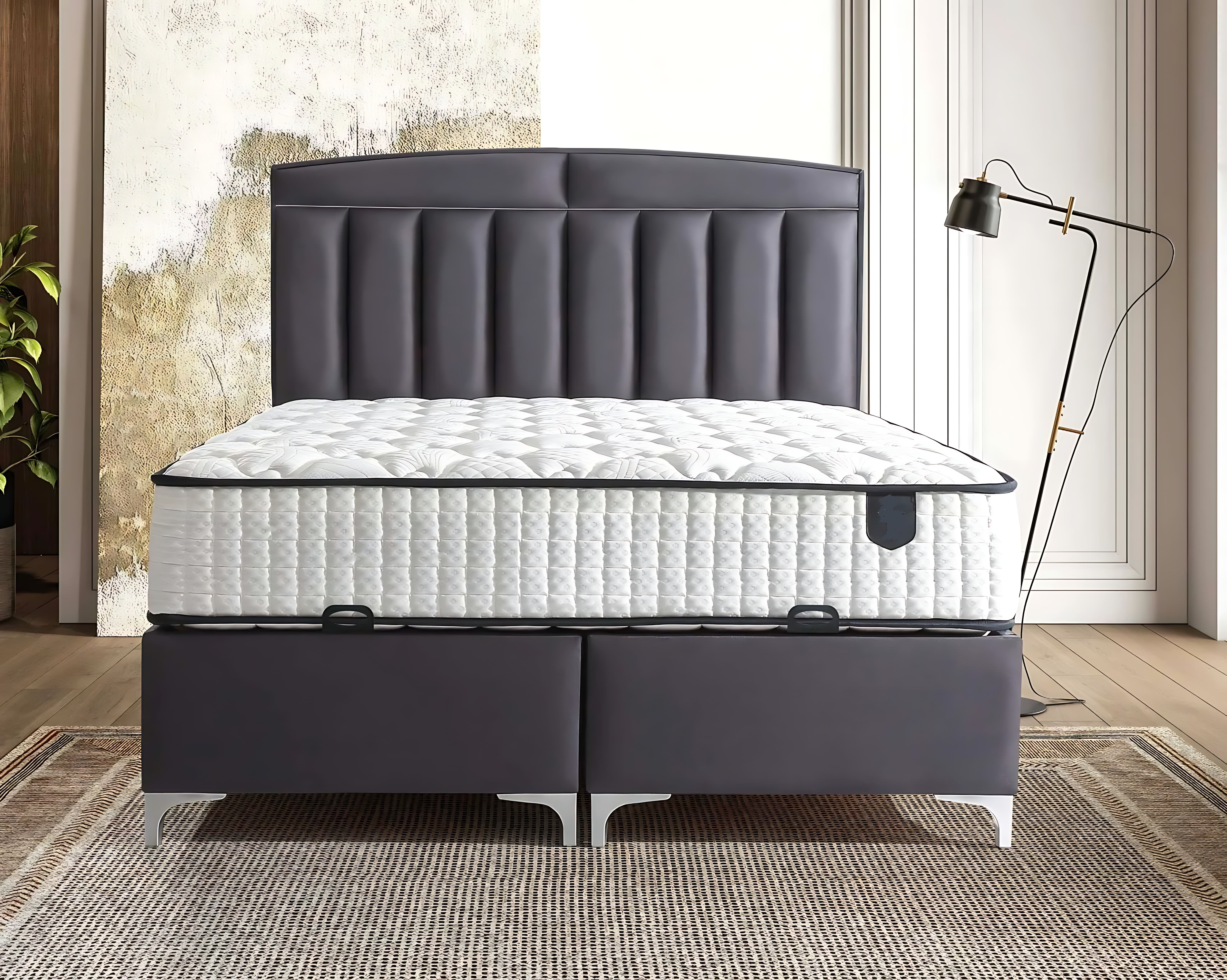 Moderni harmaa sänky tekstiili- ja puupatjalla on täydellinen yhdistelmä tyyliä ja mukavuutta, joka nostaa makuuhuoneesi ilmeen uudelle tasolle. Sen hienostunut harmaa puuviimeistely tarjoaa ajattoman eleganssin, joka sulautuu saumattomasti mihin tahansa sisustukseen. Laadukkaat materiaalit ja huolellinen käsityötaito takaavat erinomaisen kestävyyden ja käyttömukavuuden. Tämä sänky ei ole pelkästään nukkumapaikka, vaan myös näyttävä keskipiste, joka heijastaa ainutlaatuista elämäntyyliäsi. Valitse moderni harmaa sänky, ja anna sen luoda rauhoittava ja ylellinen tunnelma, joka lumoaa vieraat ja kutsuu sinut rentoutumaan korkealaatuiseen uneen.