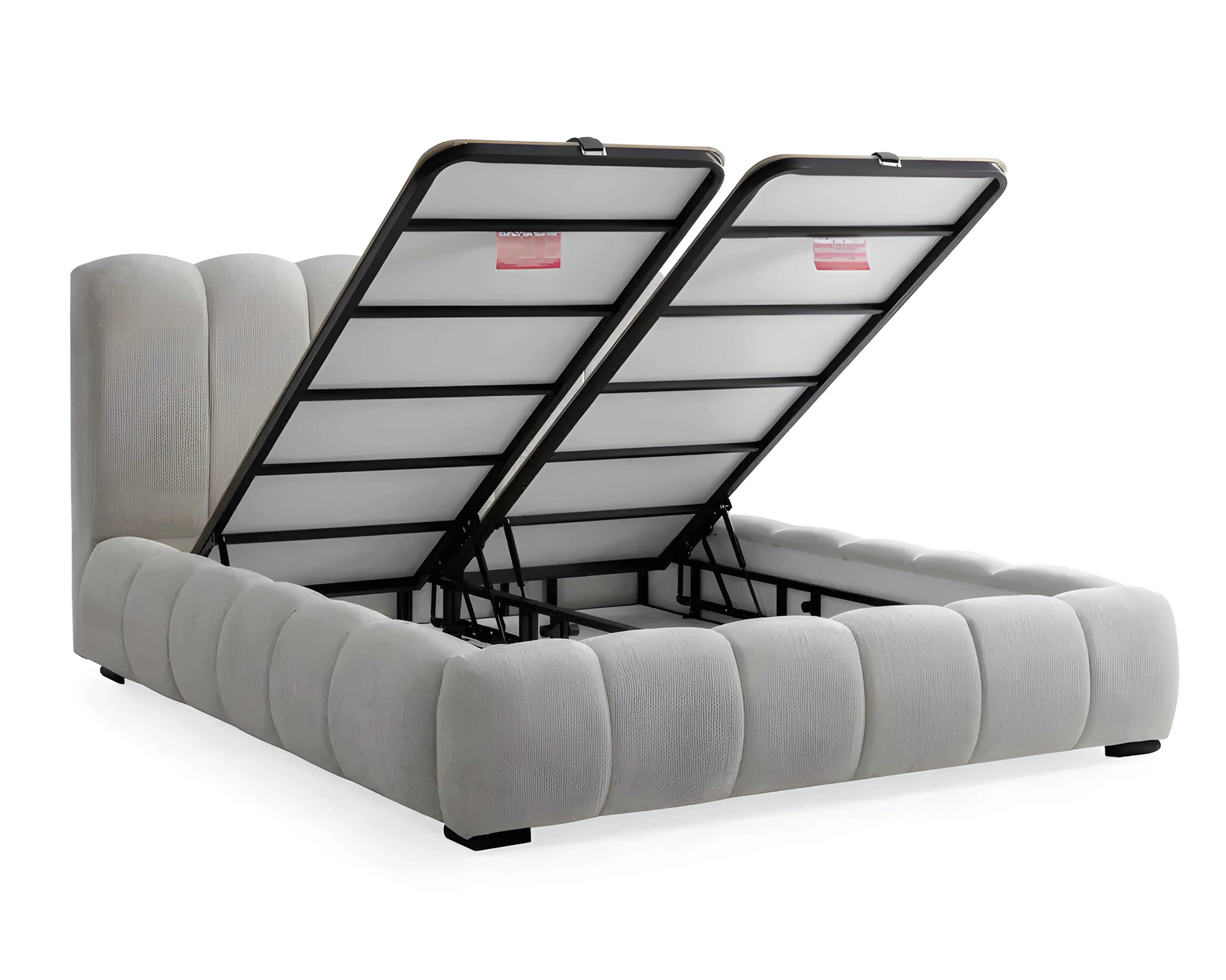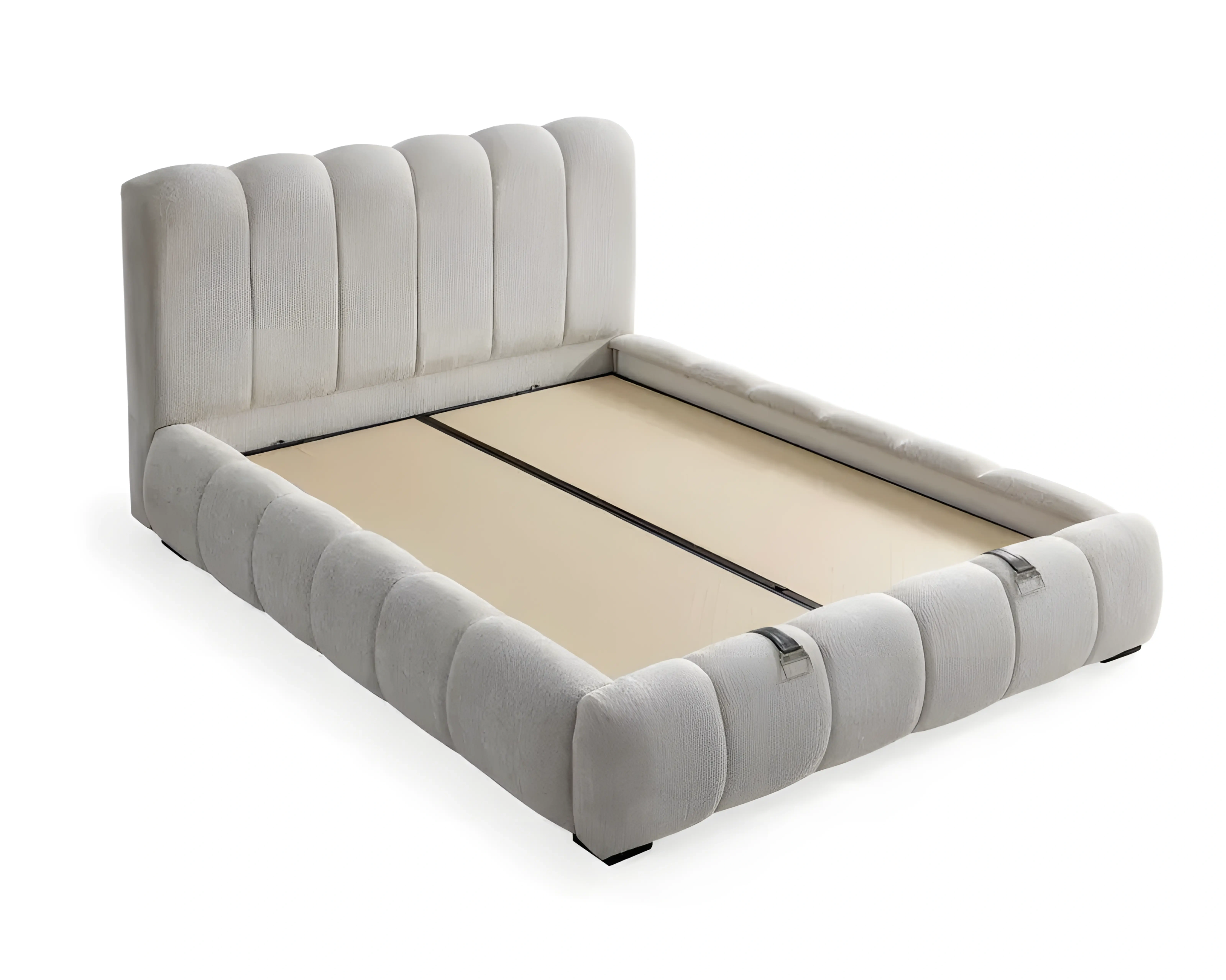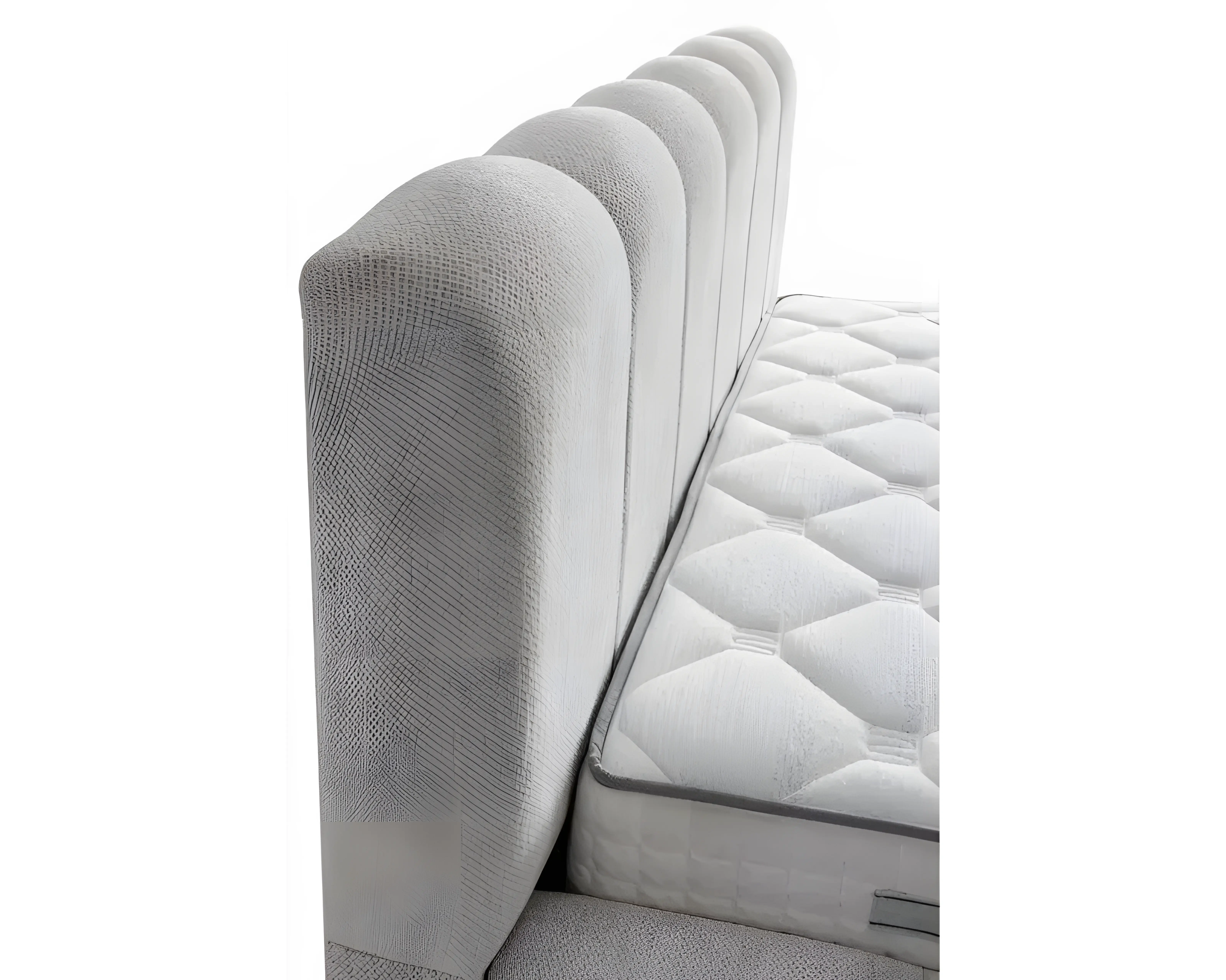 Moderni valkoinen tekstiilivuode laadukkaalla patjalla | xlhuonekalut.fi
