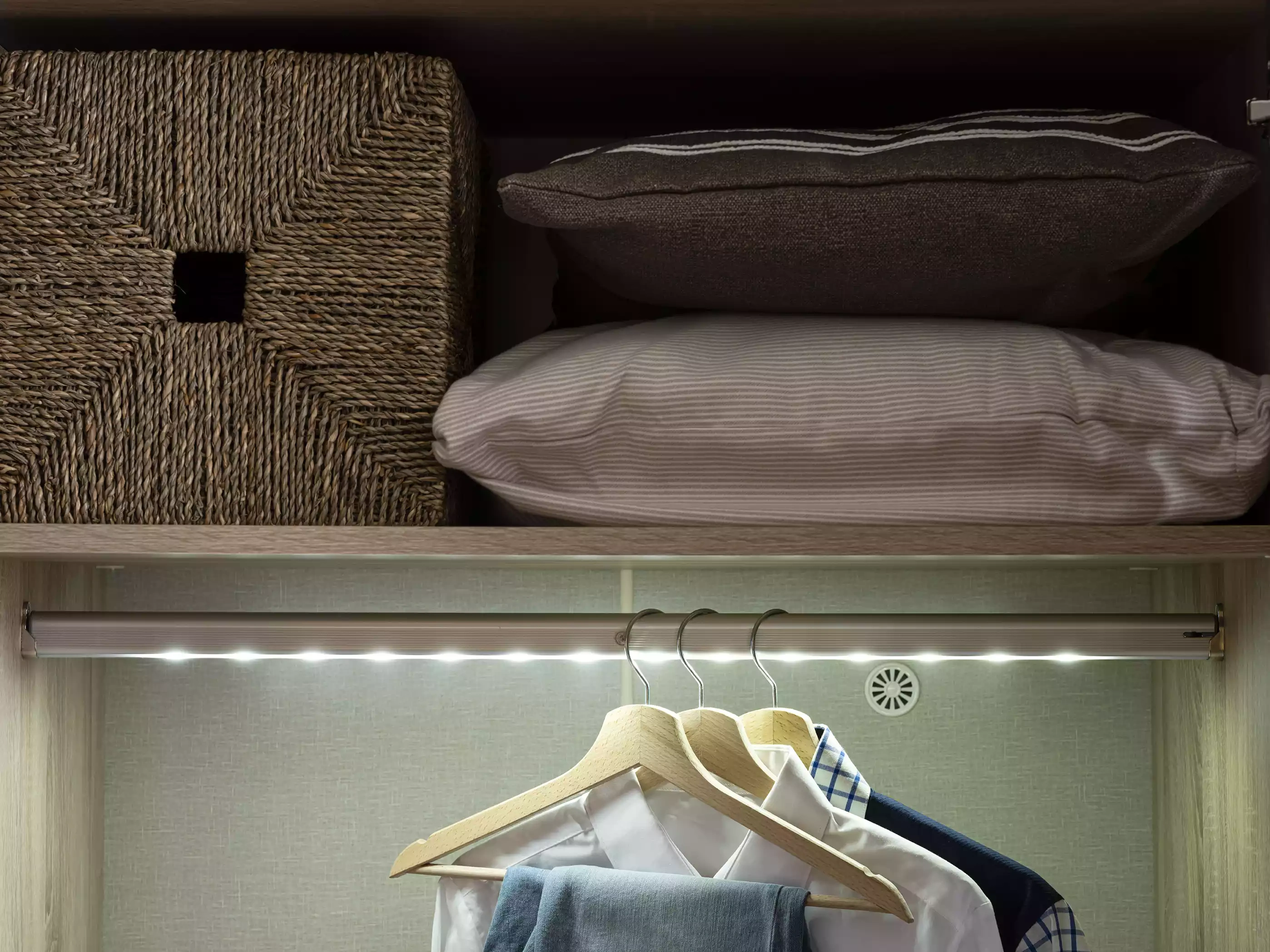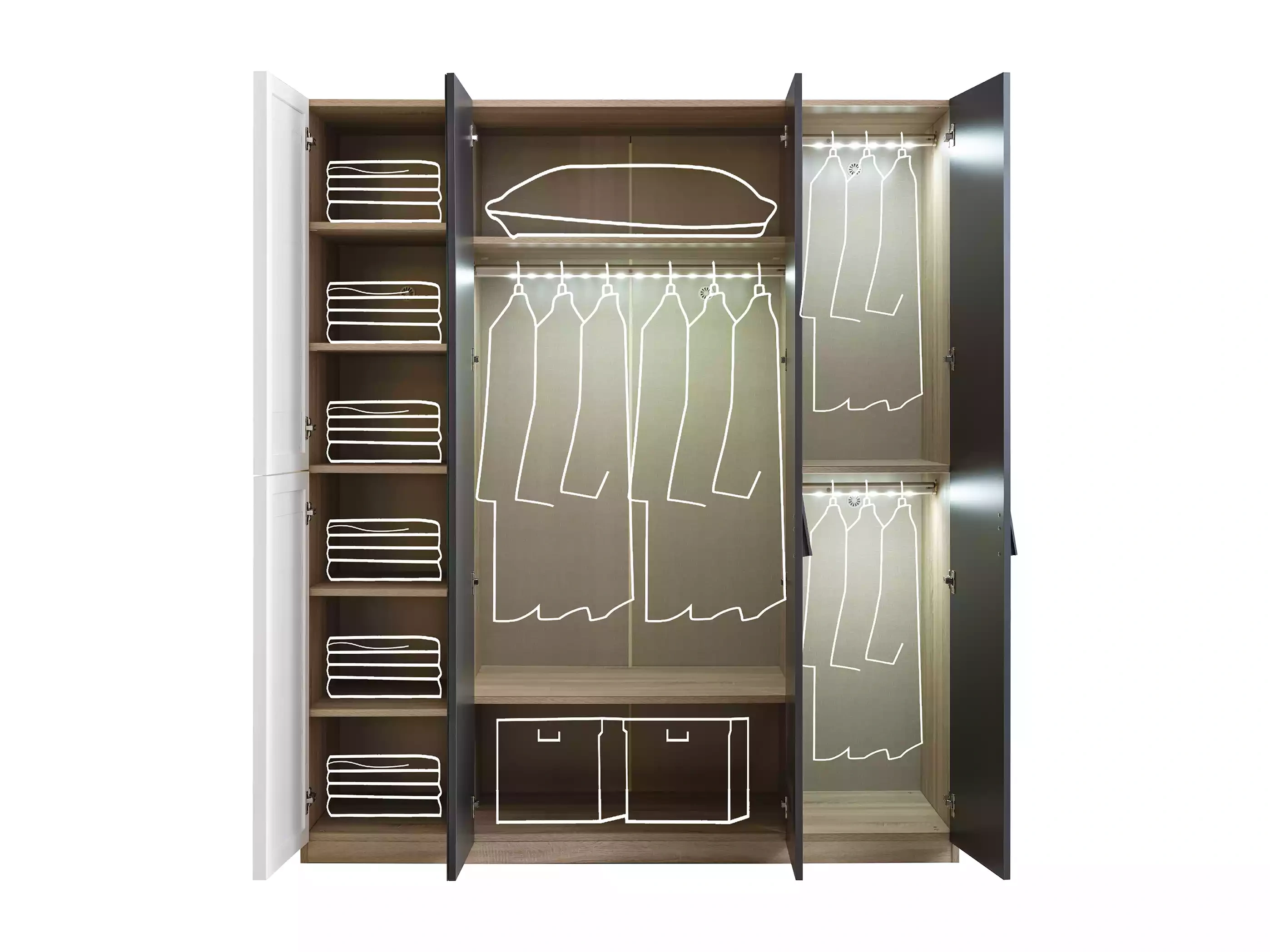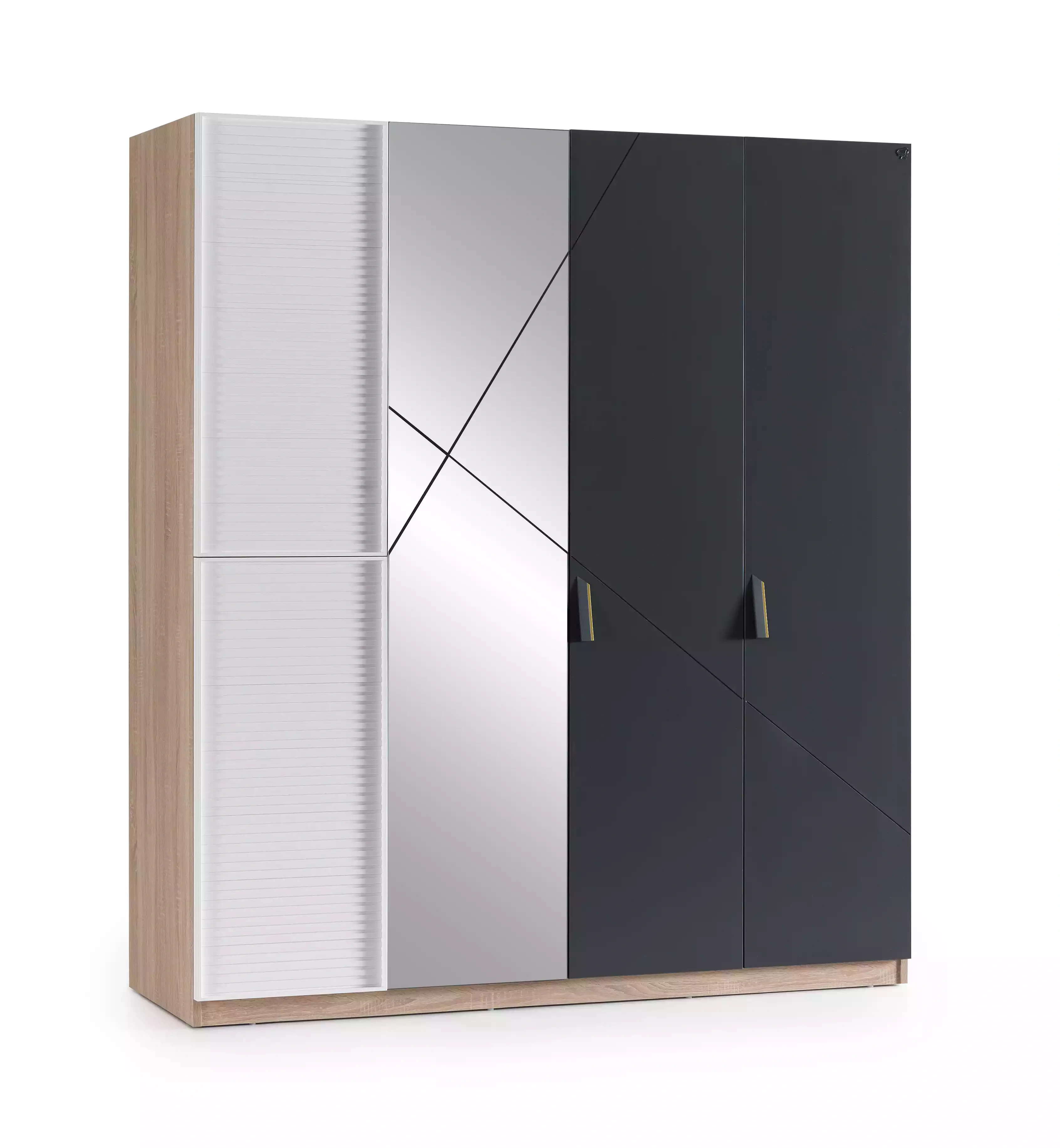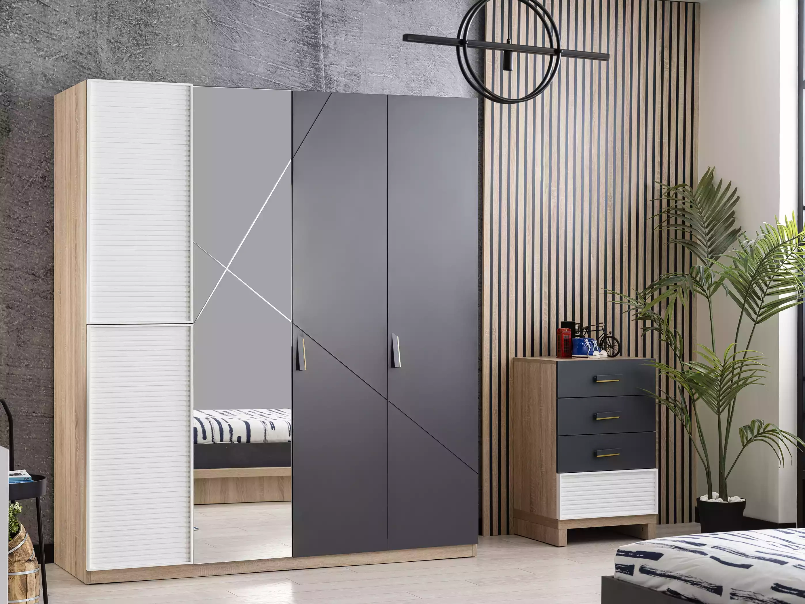 Harmaa puinen kaappi, jossa on 4 ovea ja peili lastenhuoneeseen